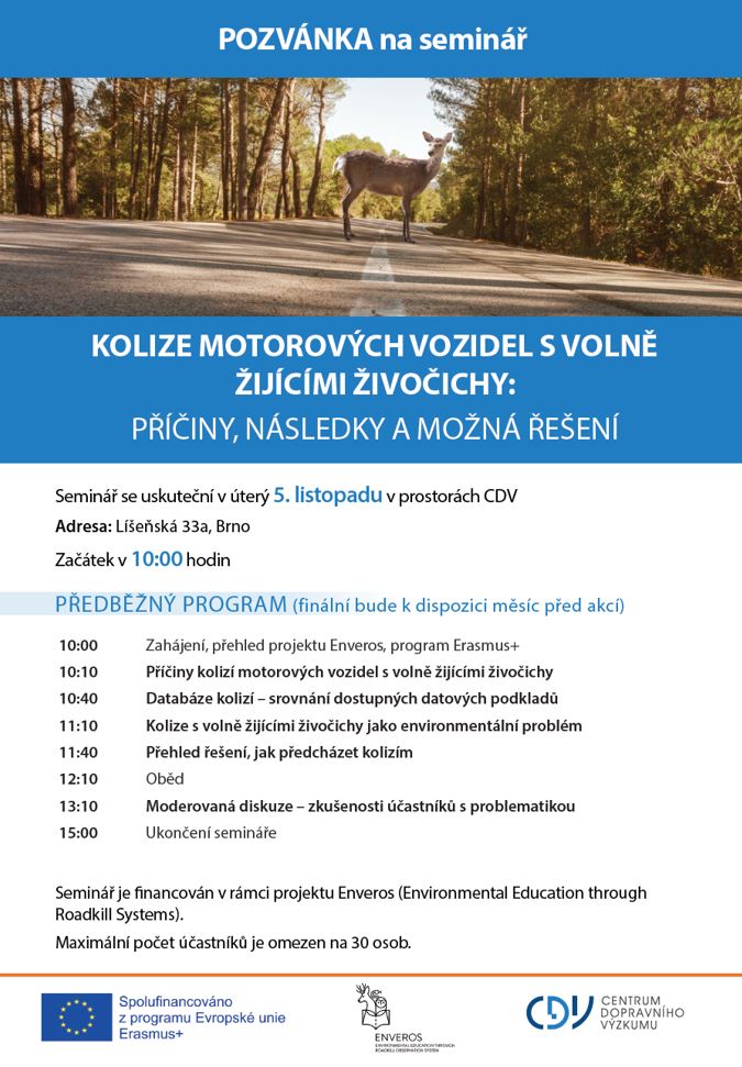 CDV pořádá v úterý 5. listopadu od 10 h seminář k problematice mortality živočichů na silnicích. Máte-li zájem se účastnít, pošlete e-mail na adresu gis@cdv.cz. Počet míst je omezen.